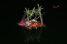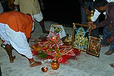 Am Flussufer bauen sie mit Pulverfarbe und Götterbildern ihren Altar auf |