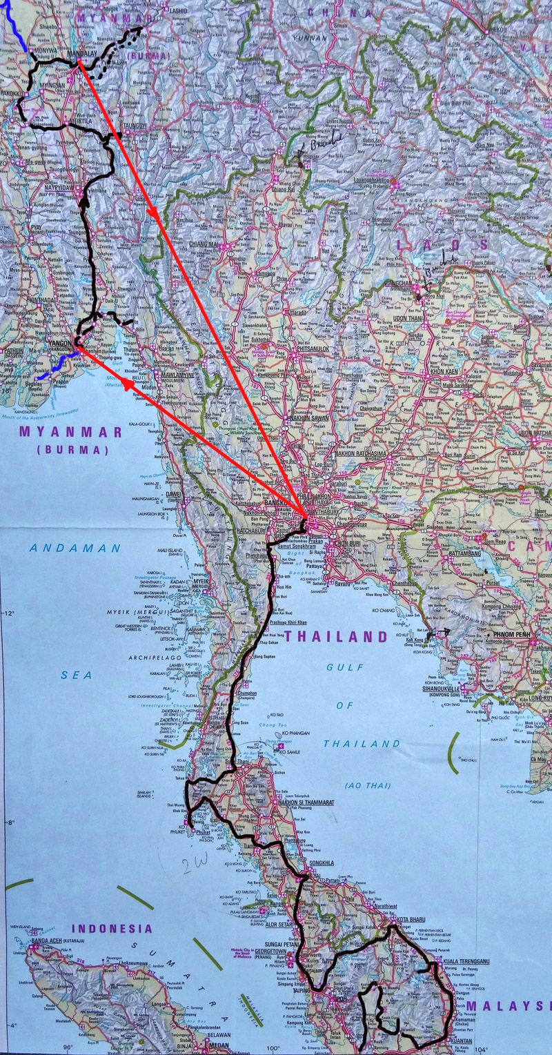 Route: (Malaysia) Port Klang – Melaka – Cameron Highlands – Taman Negara – Cherating – Georgetown – Bathu Ferringi – (Thailand) Hat Yai – Krabi – Bangkok – (Myanmar) Yangon – Ayeyarwadi Delta – Golden Rock – Bagan – Monywa – Mandalay – Hsipaw – Thailand vom 09.09. bis 26.11.2014 |